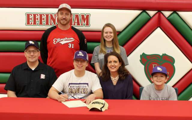 Parker Seachrist (center) signed a letter of intent to play baseball at the University of Northwestern in St. Paul, Minnesota. Seachrist signed at Effingham High School Gym Wednesday. Seachrist is seated between his parents Dewayne and Jenny Seachrst and his brother Max Seachrst. Standing, left to right are EHS Coach Chris Fleener and Seachrist's sister, Riley Seachrist.