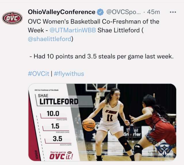 Shae Littleford Earns Co-Freshman Of The Week Honors In OVC