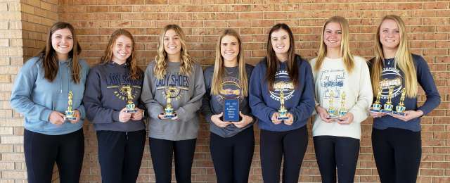 Winning awards for the 2021-22 girls basketball season were, left to right, Kaylee Niebrugge (two-point field goal percentage), Zoe Cremens (three-point field goal percentage), Izzy Hardiek (free throw percentage), Grace Tegeler (mental attitude), Courtney Gibson (Most Improved Player), Emily Konkel (defense, assists) and Kaitlyn Schumacher (steals, rebounds, Most Valuable Player).