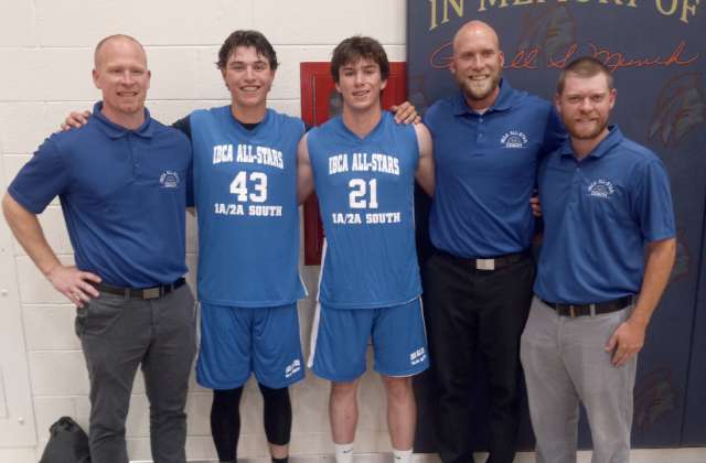The boys 1A-2A South basketball players included Logan Fleener of North Clay along with Mason Robinson and Avery Jahraus of Altamont. The 1A-2A South boys team was coached by John Niebrugge of Altamont, assisted by Trenton Kull and Logan Hill.