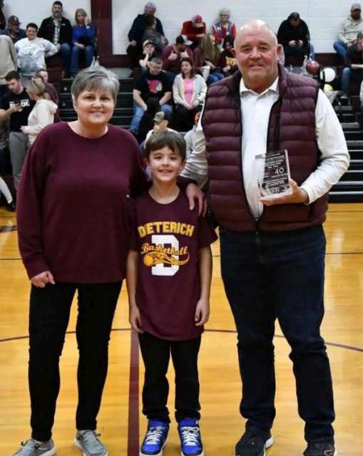 Chuck Frtischer was honored by Dieterich schools Tuesday for retiring after keeping the book and clock for Dieterich High School basketball for 40 years. Looking on are his wife Lisa and grandson Lincoln Sanguinetti.
