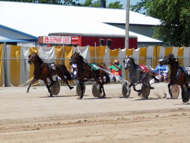 Sis's Ellie Mae, owned by Chuck Doehring of Brownstown and driven by Newton's Jared Finn, moved into the lead by a length and a half. Sis's Ellie Mae continued to show the way leading stablemate Trixie's Jethro, also owned by Doehring and driven by Dennis Gardner.