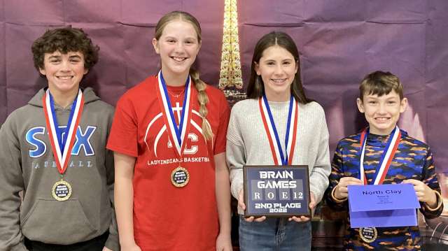 The North Clay seventh-grade team placed second out of 19 teams in Brain Games, sponsored by ROE 12. The team consisted of Will Ballard, Mila Zink, Laila Smith and Shooter McKinney. They will advance to the sectional competition in April.