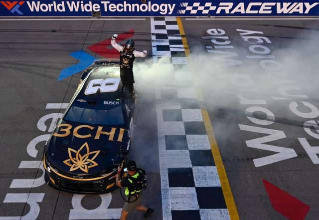 Kyle Busch of Richard Childress Racing celebrates winning last season’s Enjoy Illinois 300 NASCAR Cup Series race at World Wide Technology Raceway in Madison, Ill. Photo credit: Getty Images for NASCAR.