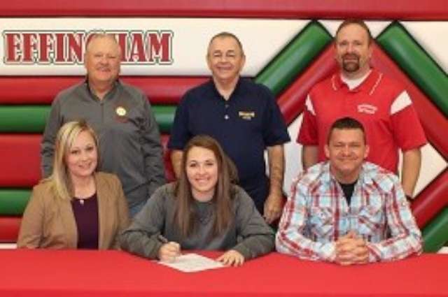 Madison Weis signed a letter of intent to play softball at Southeastern Illinois College in Harrisburg, Illinois. The signing took place in the Effingham High School gym at 11:00am today. Pictured are, sitting, left to right, Vannessa Weis, Madison Weis and Tim Weis. Standing, left to right, Coach Jerry Trigg, Southeastern Illinois head coach Donn Gines and EHS volunteer assistant coach Jeff Tonn.