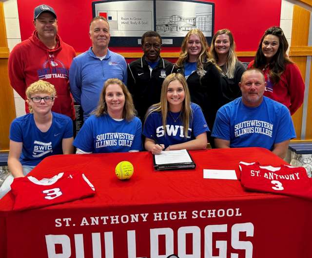 Effingham St. Anthony's Addie Wernsing (seated third from left), signs a letter of intent to play softball at Southwestern Illinois College. Looking on are, front row, left to right, her brother Nash, mother Addie and father Chad Wernsing. Back row, left to right, St. Anthony Coach Tim Walsh, Athletic Director Kevin Palmer, Southwestern. Illinois College Head coach Warren Thomas, Southwestern Illinois College assistant coaches Kelsey Cowan and Kaytie Kossina and St. Anthony Coach Makayla Taylor.