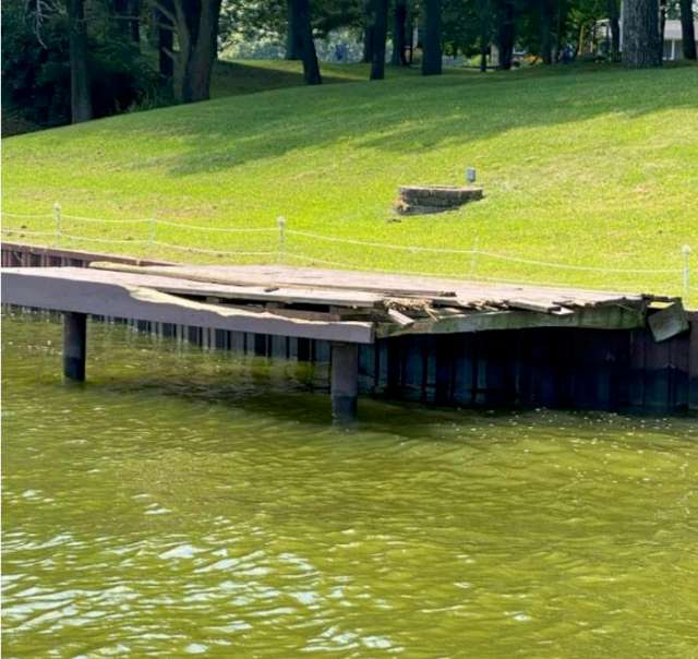 (THE DOCK DAMAGED WHEN STRUCK BY A BOAT EARLY SATURDAY MORNING)