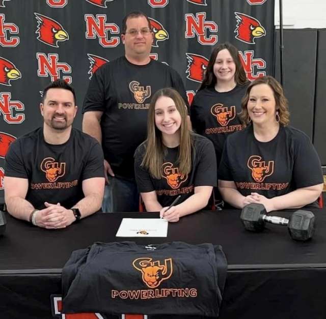 North Clay senior Madi Winterrowd (seated center) signed with Greenville University to build their powerlifting program. In the front row with Winterrowd are Greenville Head Coach Scott Voyles and Winterrowd's mother, Amanda Winterrowd. Back row, left to right, her father Matt Winterrowd and sister Mackenzie Winterrowd.