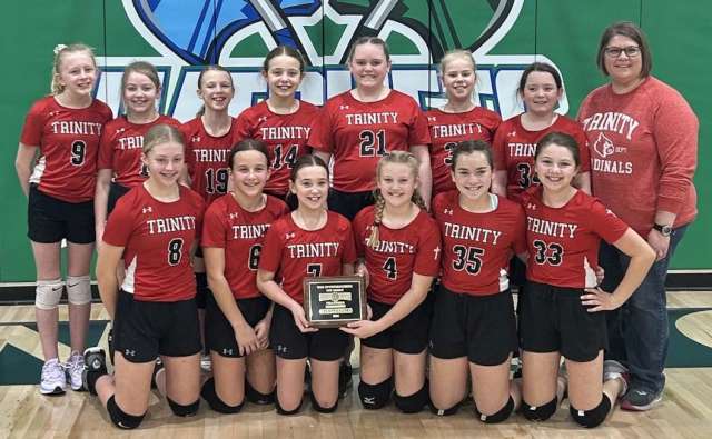 Stewardson Trinity eighth-grade won the Newton St. Thomas Tournament. Members of the team are, first row, left to right, Emma Hickman, Alyssa Zacha, Sienna Bostedo, Maddy Manhart, Callie Friese and Kierra Mueller. Back row, left to right, Coach Tammy Manhart, Tabitha Weaver, Kalia Friese, Abree Zalman, Lydia Weaver and Coach Bridgitte Friese.