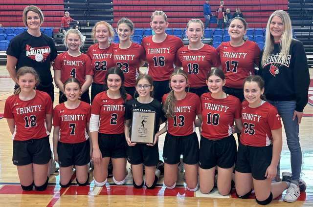 Stewardson Trinity won the championship of the Effingham St. Anthony Eighth-Grade Volleyball Tournament. Team members are, front row, left to right, Alyssa Zacha, Gia Bostedo, Sienna Bostedo, Maddy Manhart, Callie Friese, Kierra Mueller and Gracyn Montgomery. Back row, left to right, Coach Tammy Manhart, Hayden Reed, Emma Hickman, Tabitha Weaver, Kalia Friese, Abree Zalman, Lydia Weaver and Coach Bridgitte Friese.